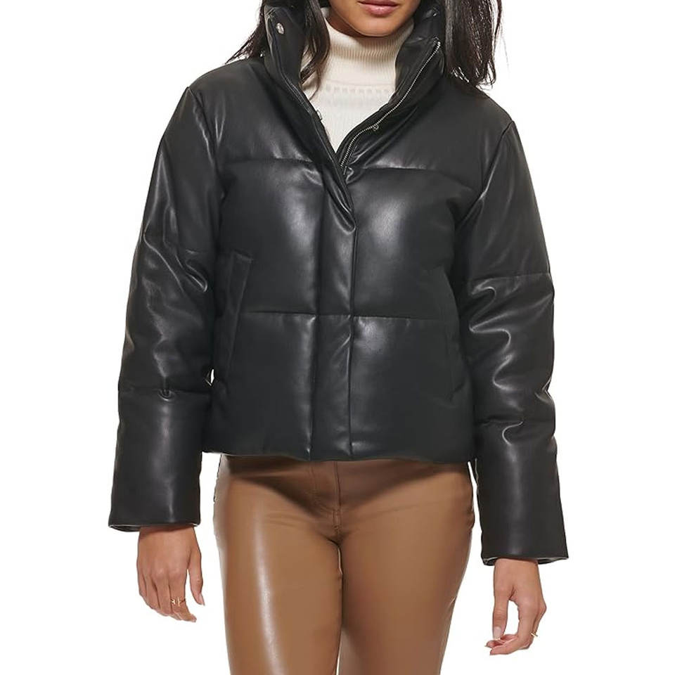 Women Vegan Leather Quilted Short Puffer Jacket Stylish Warm Winter Coat Lightweight Water-Resistant Outerwear Trendy