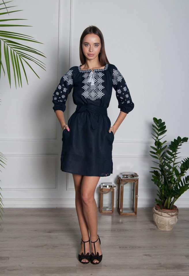 Women Vibrant Cotton Linen Embroidered Dress Ukrainian Blue White Embroidery Comfortable Plus Size Summer Dress