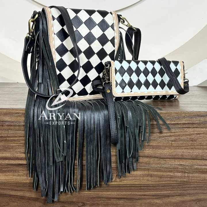 Women Vintage Style Tooled Checkered Design Fashion Trendy Fringe Handbag & Crossbody Wallet with Wristlet 2-Piece Matching Set