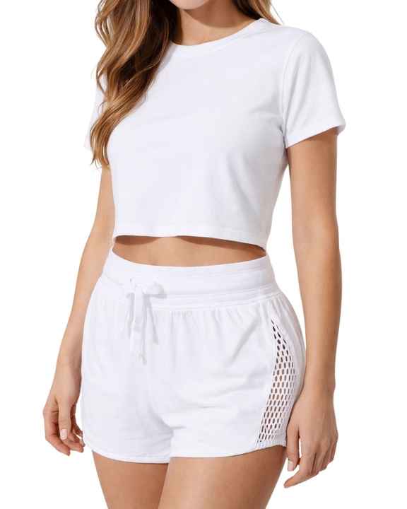 Women White Crop T Shirt And Drawstring Shorts Two Piece Set Mesh Panel Summer Casual Athletic Sportswear Activewear Outfit