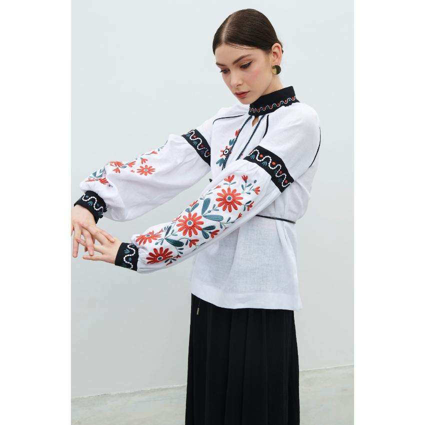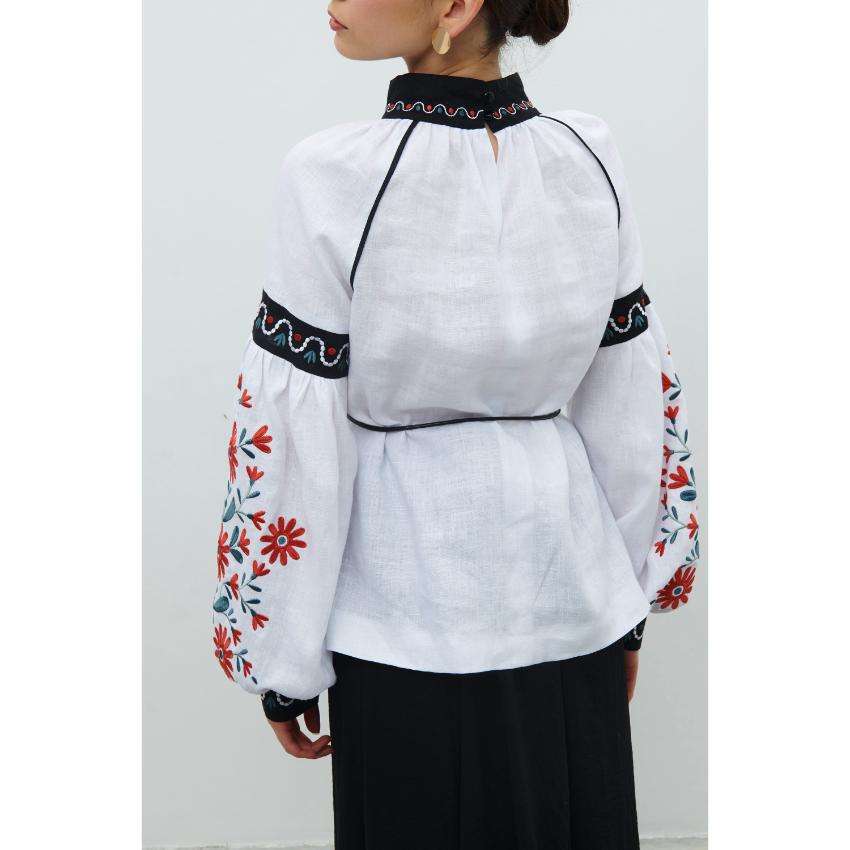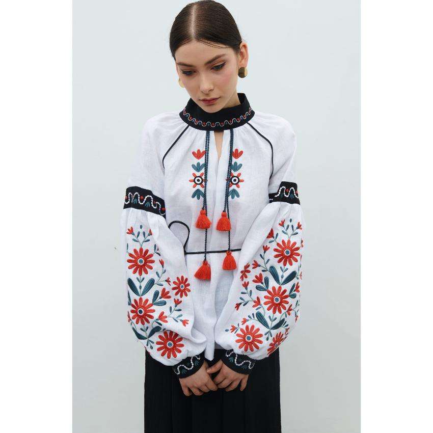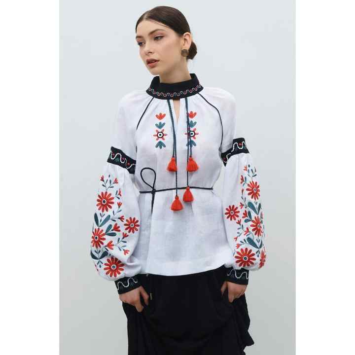Women White Embroidered Linen Blouse Ethnic Floral Hand Embroidery Top With Tassel Tie Up Neck