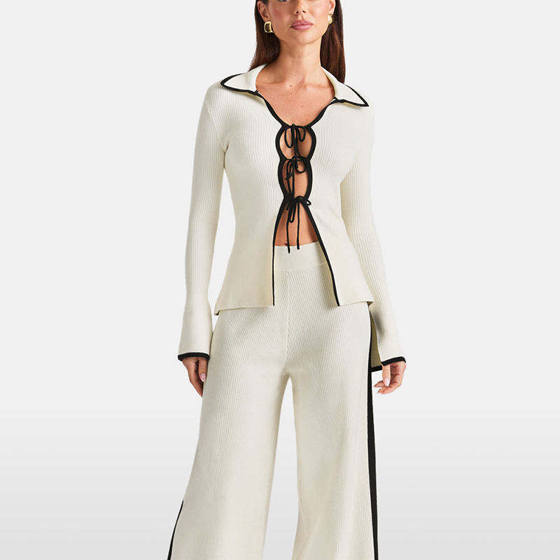 Women White Ribbed Knit Top with Black Trim and Front Tie Closure Long Sleeve Fashion Casual Blouse