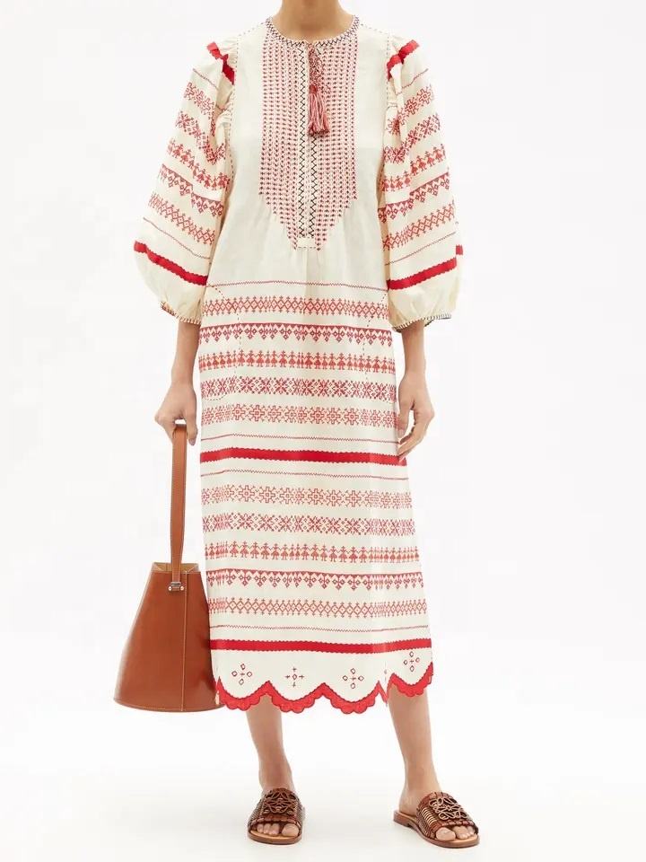 Women White Ukrainian Cotton Summer Maxi Dress With Embroidery Full Sleeve Dress for Summer Party Favour