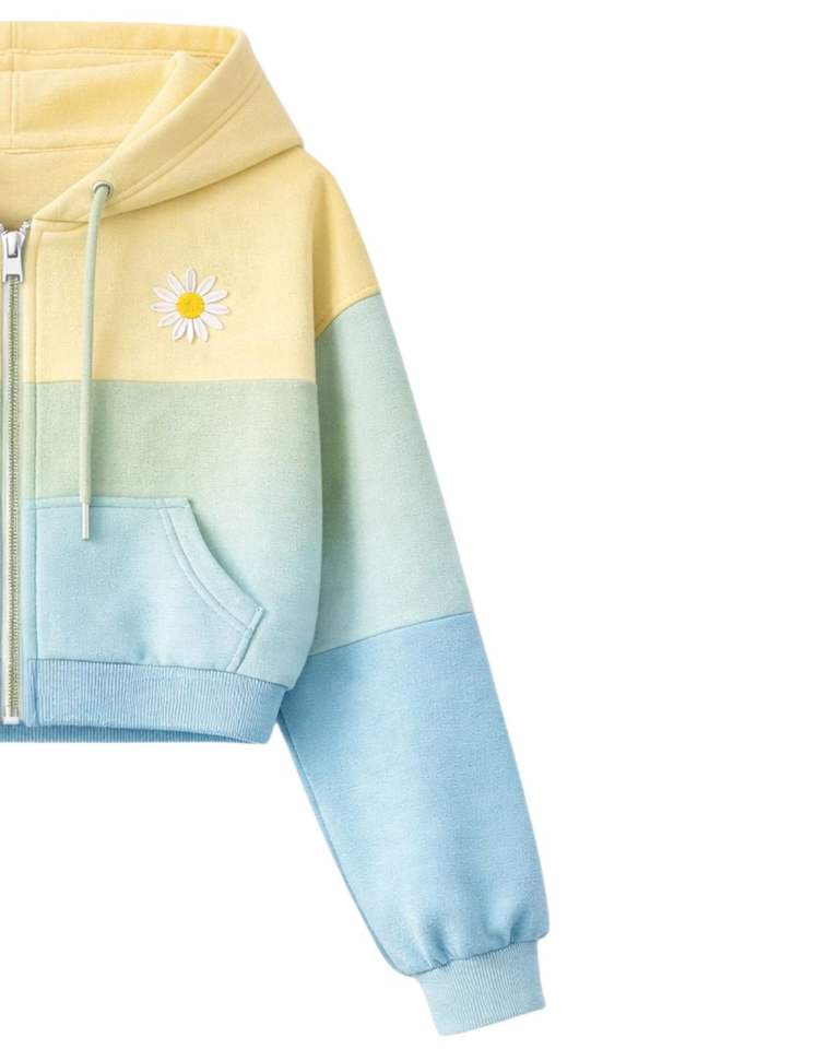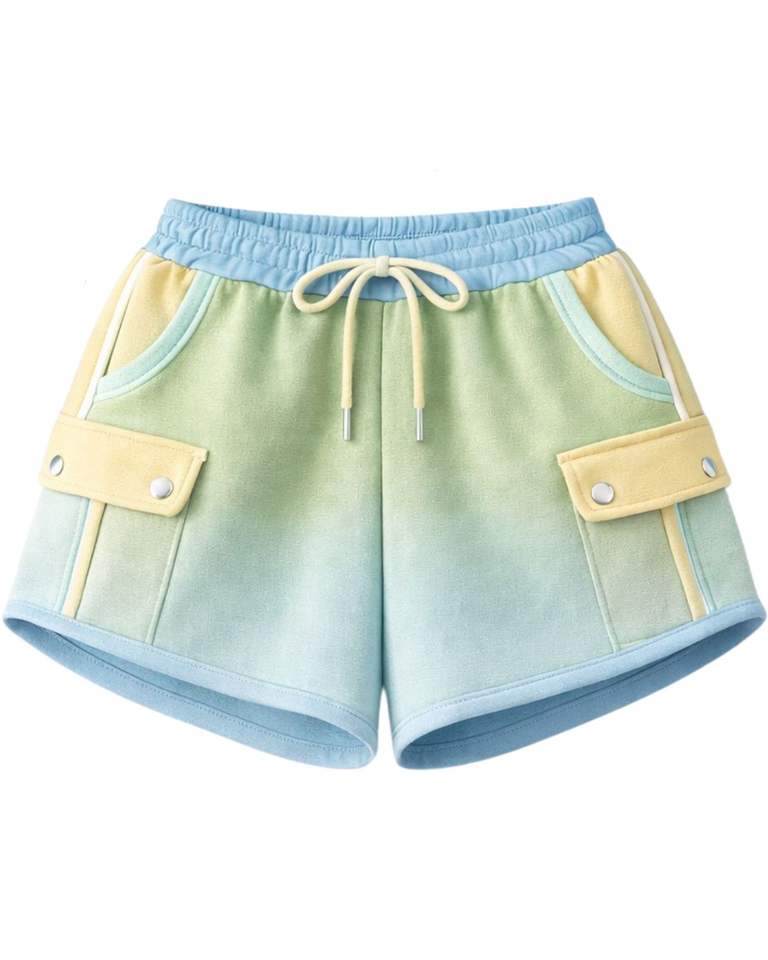 Women Yellow Mint Blue Color Block Crop Zip Hoodie Shorts Set Cargo Pocket Casual Two Piece Outfit Polyester Cotton Wholesale