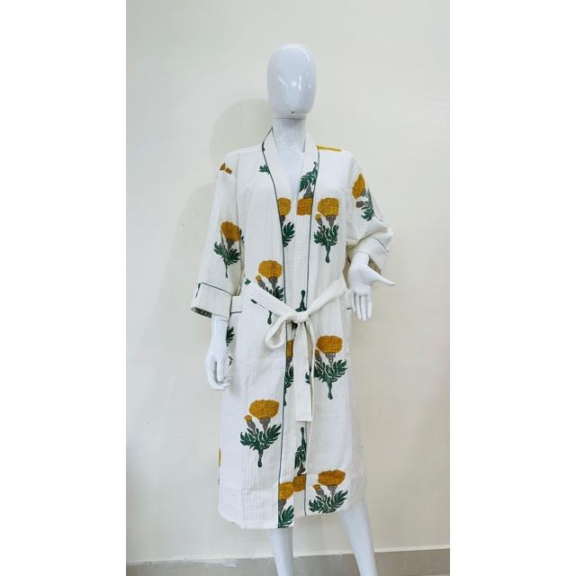 Women's Luxury Cotton Waffle Fabric Floral Printed Bathrobe & Towel Kimono Style Robe with Belt Lightweight Spa Loungewear Gown