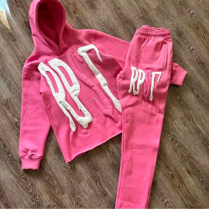 Women pink fleece tracksuit set custom logo printed hoodie and jogger pants latest fashion casual two piece outfit warm winter