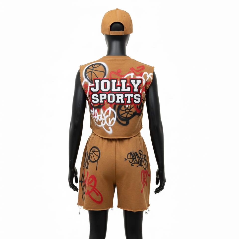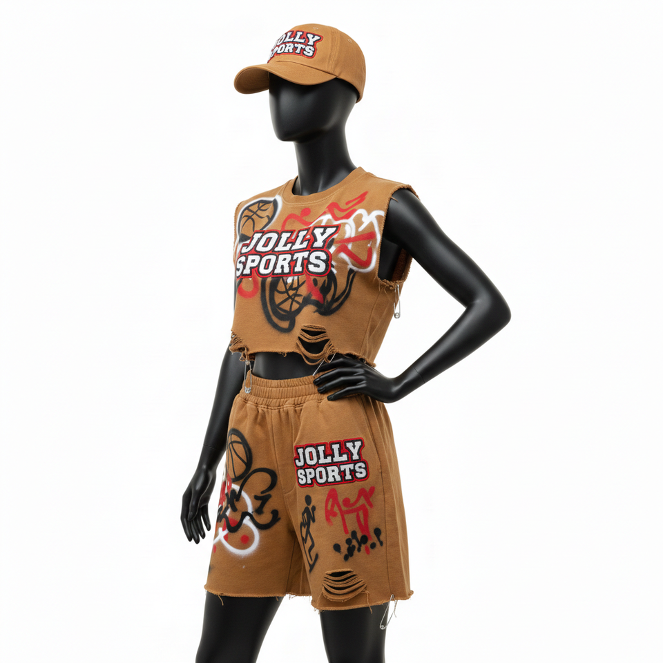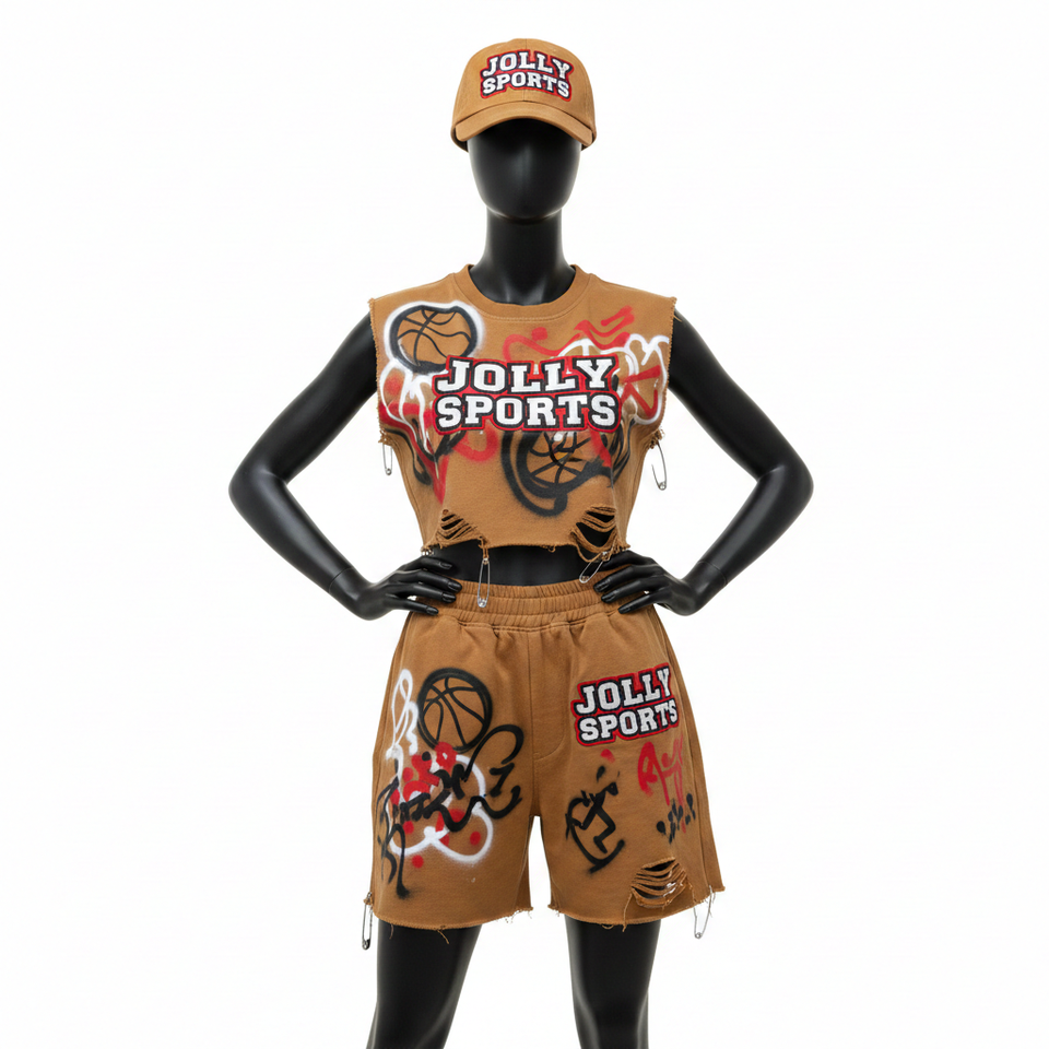 Women premium cotton fleece 300 GSM sleeveless t shirt and short set brown distressed look custom logo 100% Cotton Women's Sets