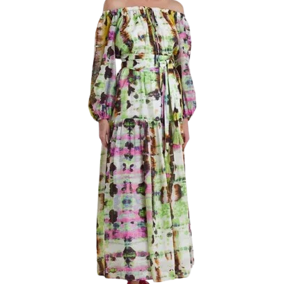 Women Printed Long Maxi Dress Balloon Sleeves with Elastic Cuffs Detachable Waist Belt with Tassel Women's Dresses
