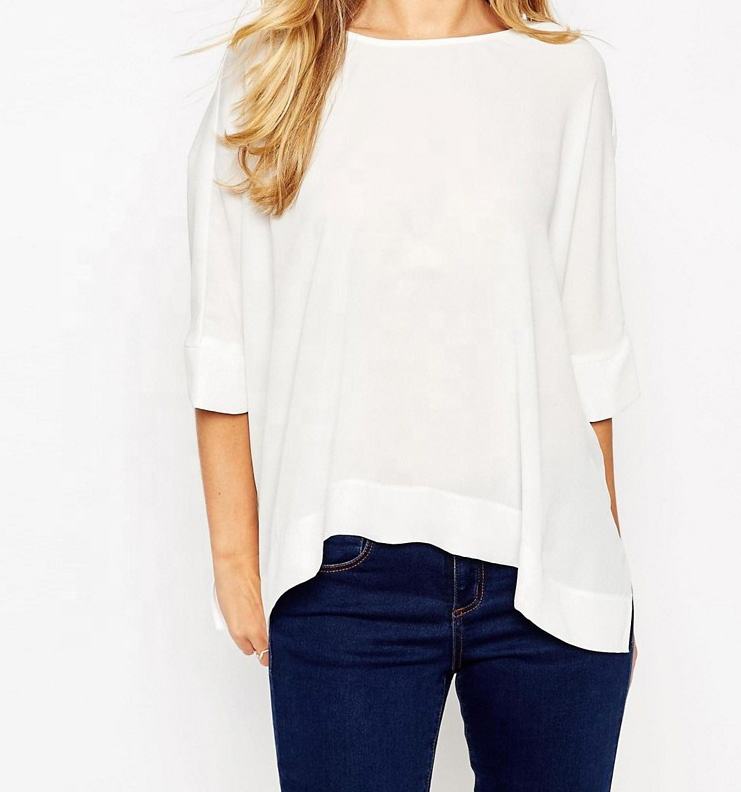 Women's 100% Polyester T-Shirt Smooth Oversize Fit Scoop Neckline Asymmetric Split Hem Longer Length Embroidery Plus Size