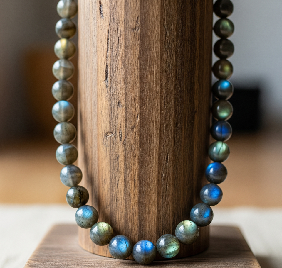 Women's 18-Inch Silver 925 Lock Hand Knotted Geometric Design Trendy Fashion Accessory Labradorite Stone Beaded Necklace