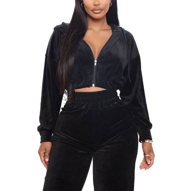 Women's 2 Piece Outfits Velvet Tracksuit Zip up Croptop Style Hoodie Velour Sweatpants Workout Sweatsuit