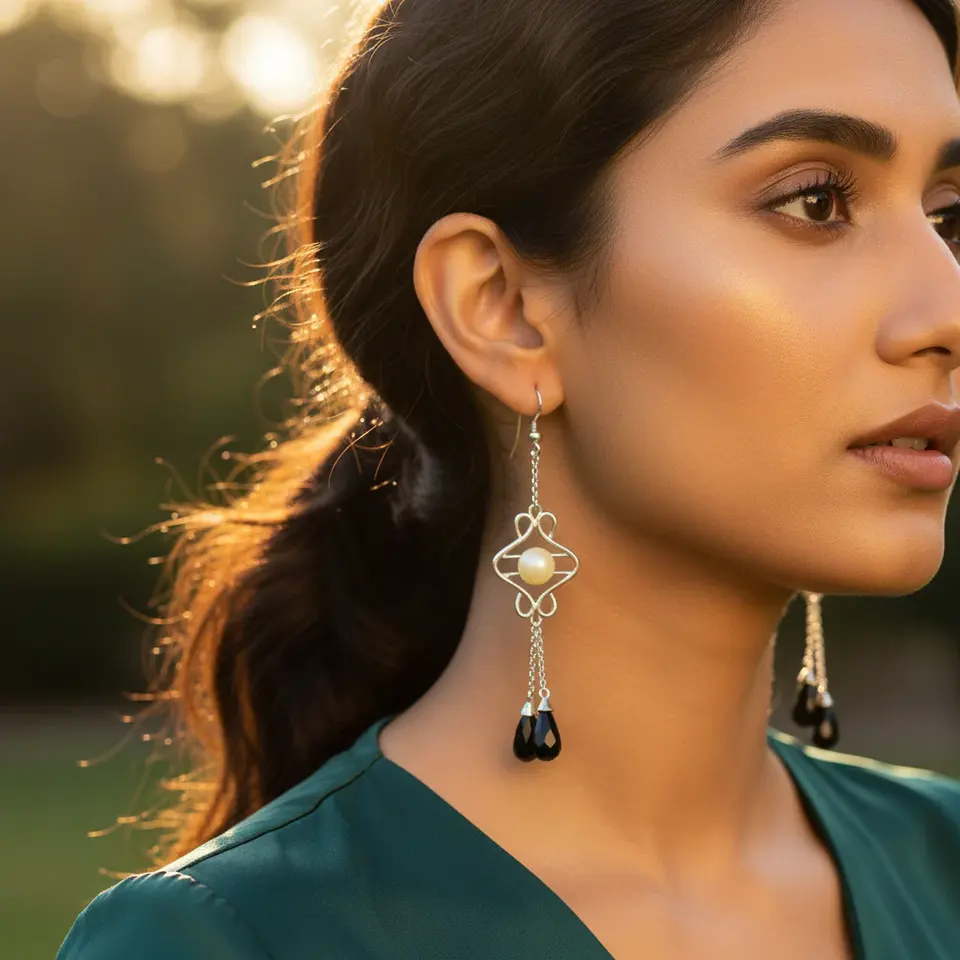 Women's 925 Silver Black Onyx Dangle Earrings Gold Plated Drop Hoop Jewelry with Pearl and Diamond for Wedding