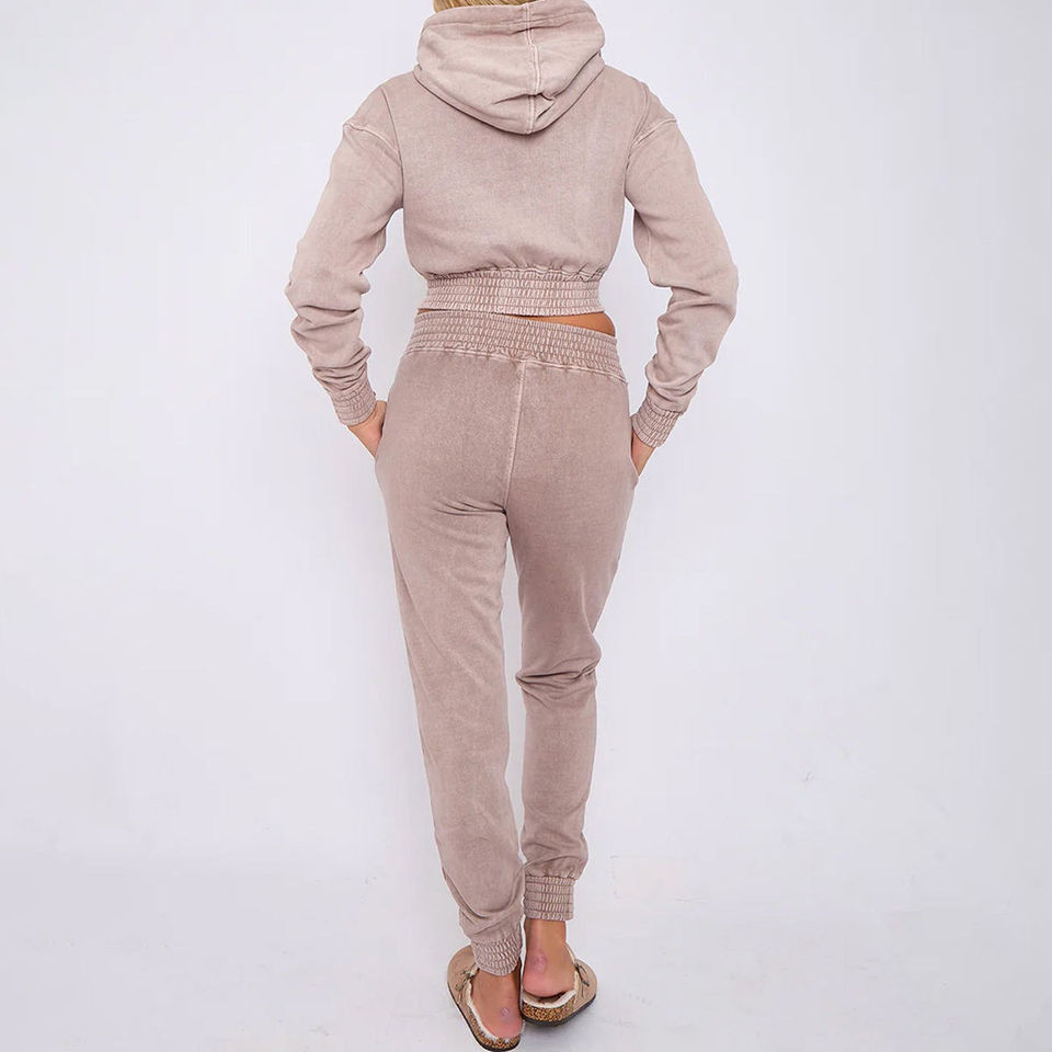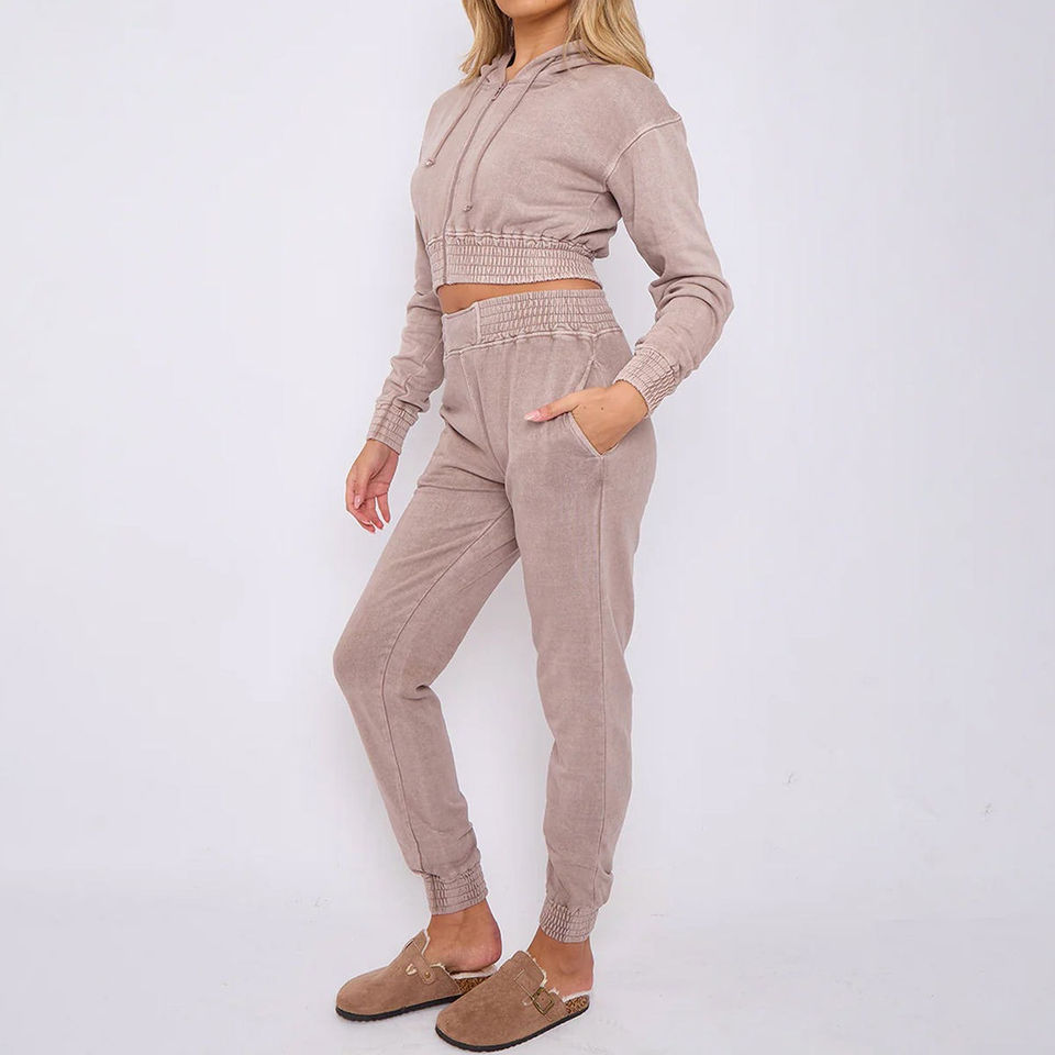 Women's Acid Wash Cropped Hoodie and Joggers Track Suits Solid Pattern Winter One-Set Sale Price Customized Women Tracksuits