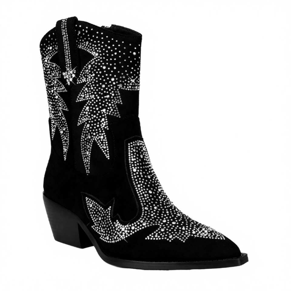 Women's Ankle Chunky Heel Cowgirl Western Cowboy Boots Black Rhinestone Autumn