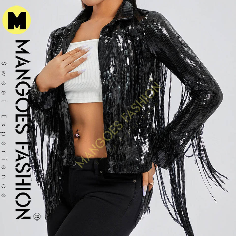 Women's Autumn Winter Black Color Sequin Party Jackets Sparkly Long Sleeve Open Front Tassel Blazers Cotton Filling Quilted