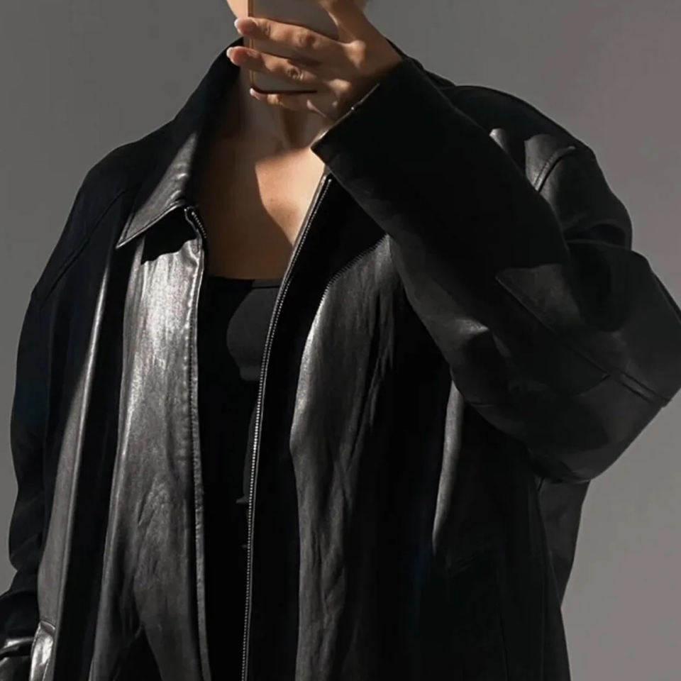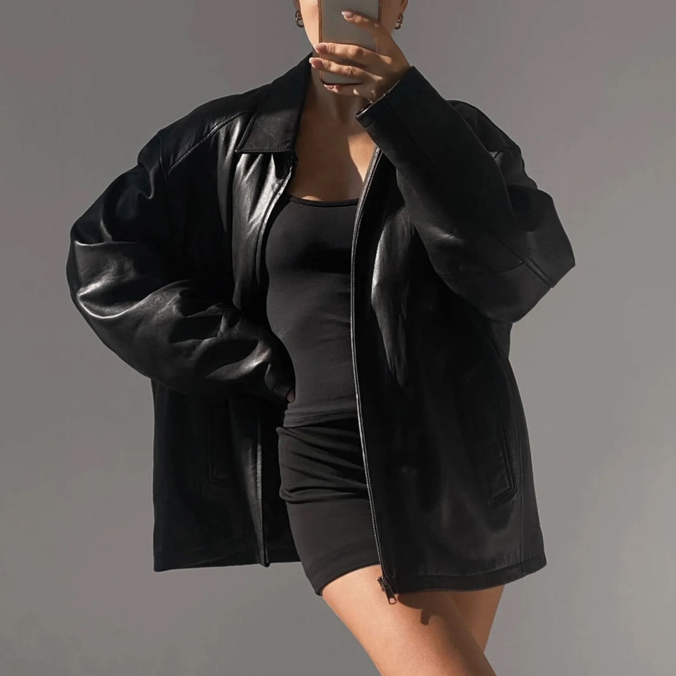 Women's Autumn/Winter Real Sheep Skin Leather Bomber Jacket Long Oversized Plus Size Windproof Outdoor Wear