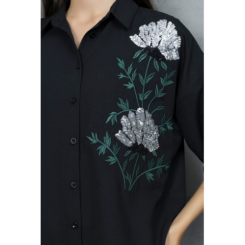 Women's Ayrobin Black Oversize Low Sleeve Shirt with Epaulettes and Sequin Embroidery Pattern Available in Sizes S-M-L-XL