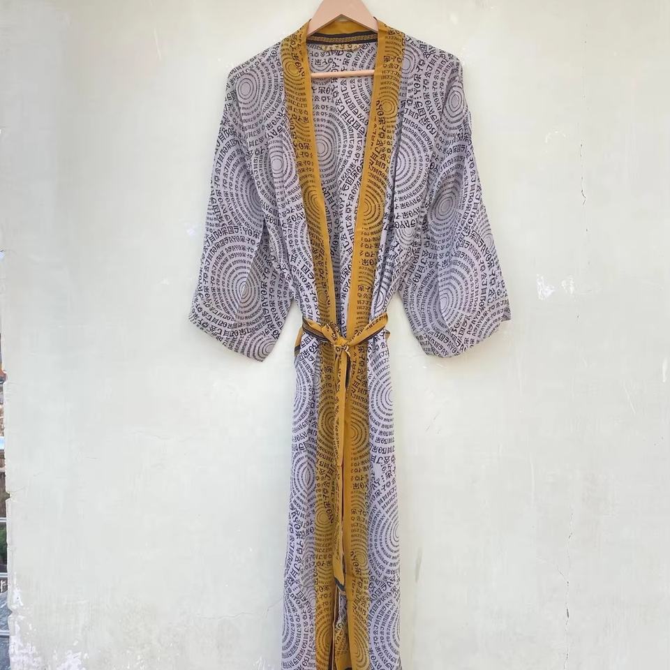 Women's Beautiful Black and White Floral Smooth Cardigan Robe with Yellow Border Free Size Summer Autumn Spring Kimono Gown