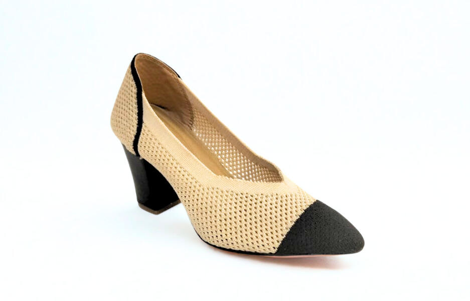 Women's Beige and Black Knit Pointed Toe Block Heel Pumps | Fashion Office and Casual Wear Shoes