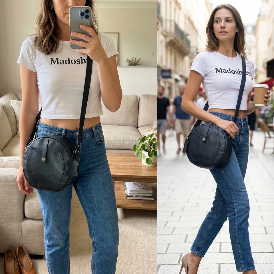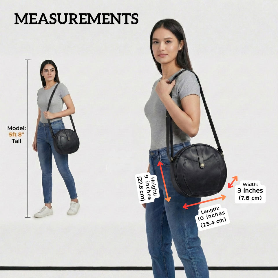 Women’s Black Genuine Leather Round Crossbody Bag – Lightweight Circular Shoulder Purse with Zipper Closure