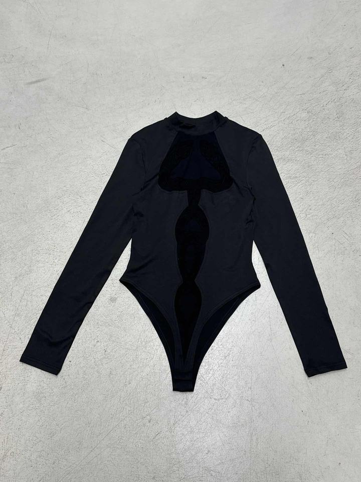Women's Black Mesh Long Sleeve Bodysuit Snake Pattern Sheer Patchwork Slim Fit Gothic Sexy Club Party Jumpsuit