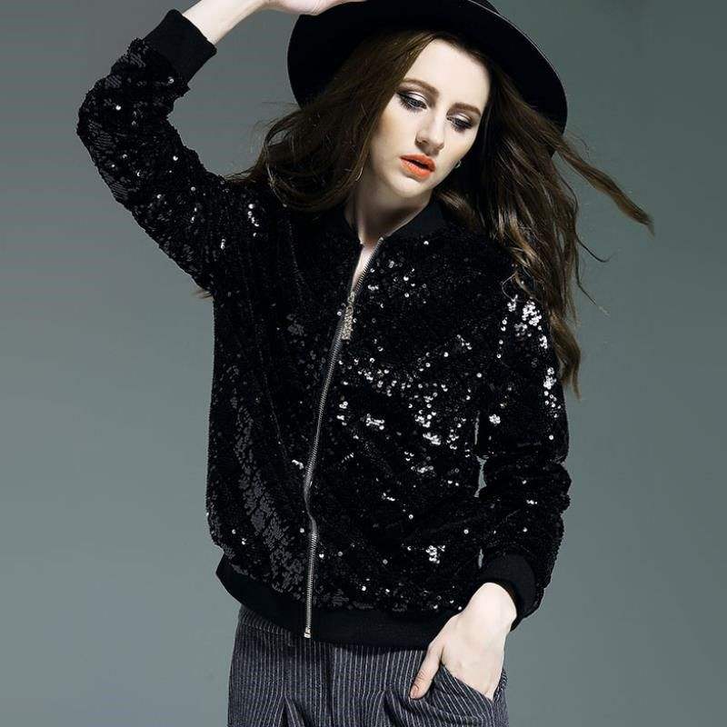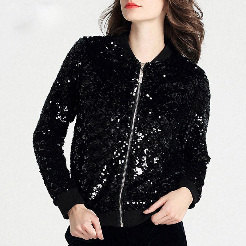 Women’s Black Sequin Bomber Jacket Zip-Up Party Wear Fashion Outerwear