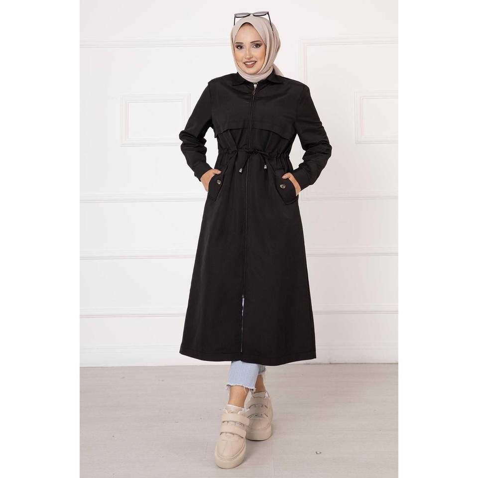 Women's Black Trench Coat Waist Tunnel Belted Pocket Double Breasted Closure Waterproof Print Decoration Long Short for Spring