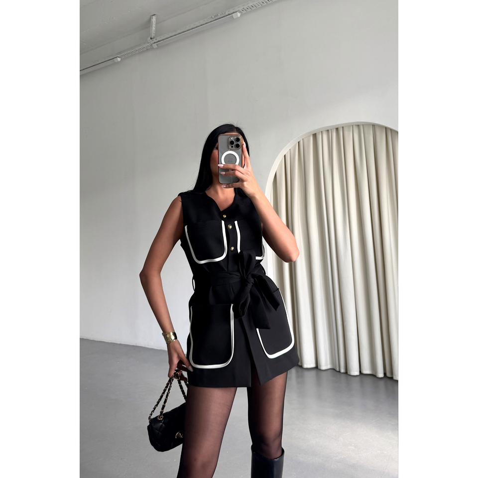 Women's Black Vest with Piping Detail Large Pocket Elegant Waistcoat Style