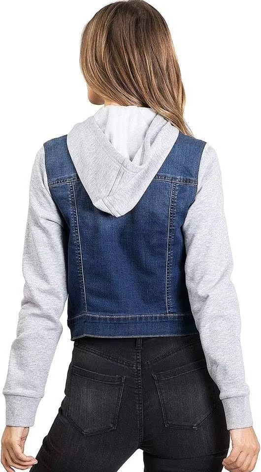 Women's Blue Cropped Denim Jacket with Long Sleeves Front Pockets Breathable Knitted Cotton
