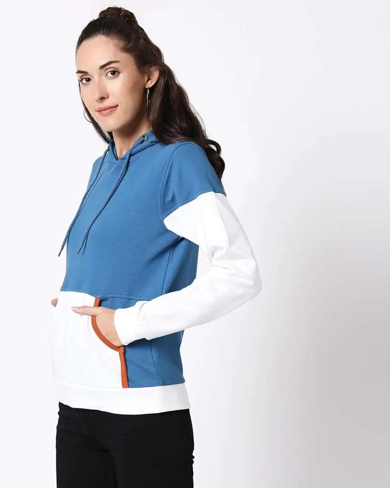 Women's Blue White Color Block Hoodie Fleece Pullover Long Sleeve Soft Warm Custom Option Stylish Casual Wear Front Breathable