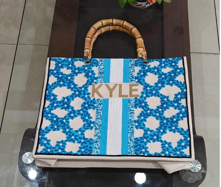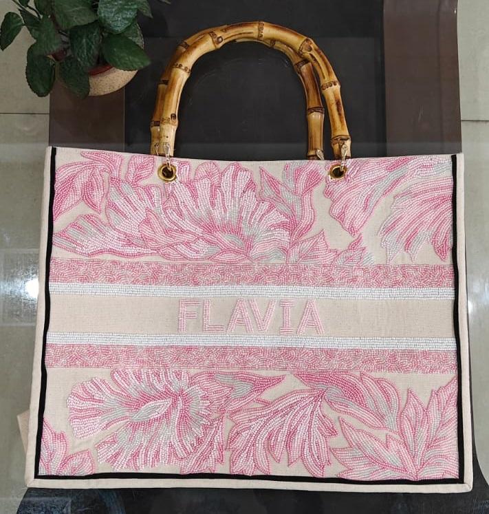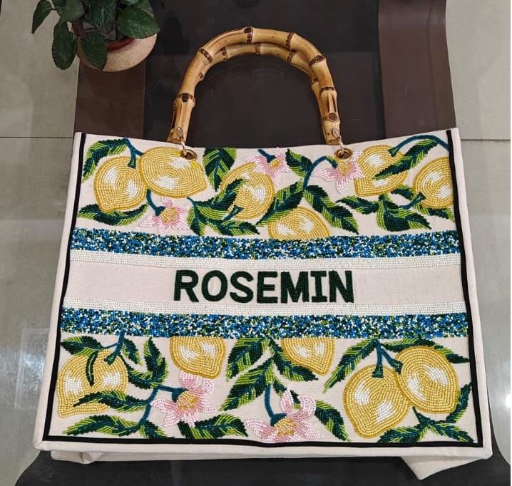 Women's Large Bohemian Tote Handbag Casual Open Top Design with Bamboo Handles & Pearl Beading Durable Large Capacity Feature
