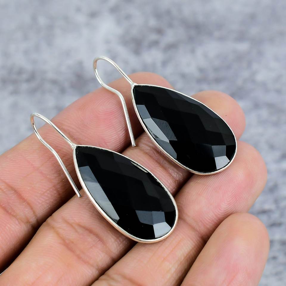 Women's Bohemian Style Black Onyx 925 Sterling Silver Teardrop Gemstone Earrings Trendy Statement Gift for Parties