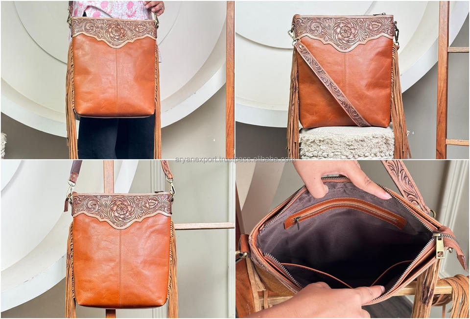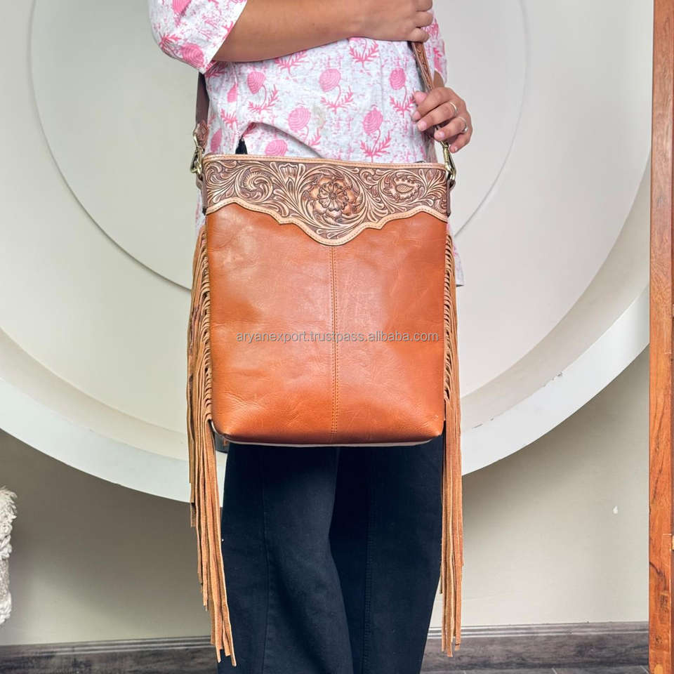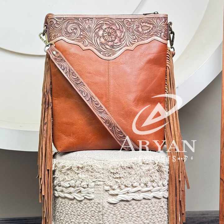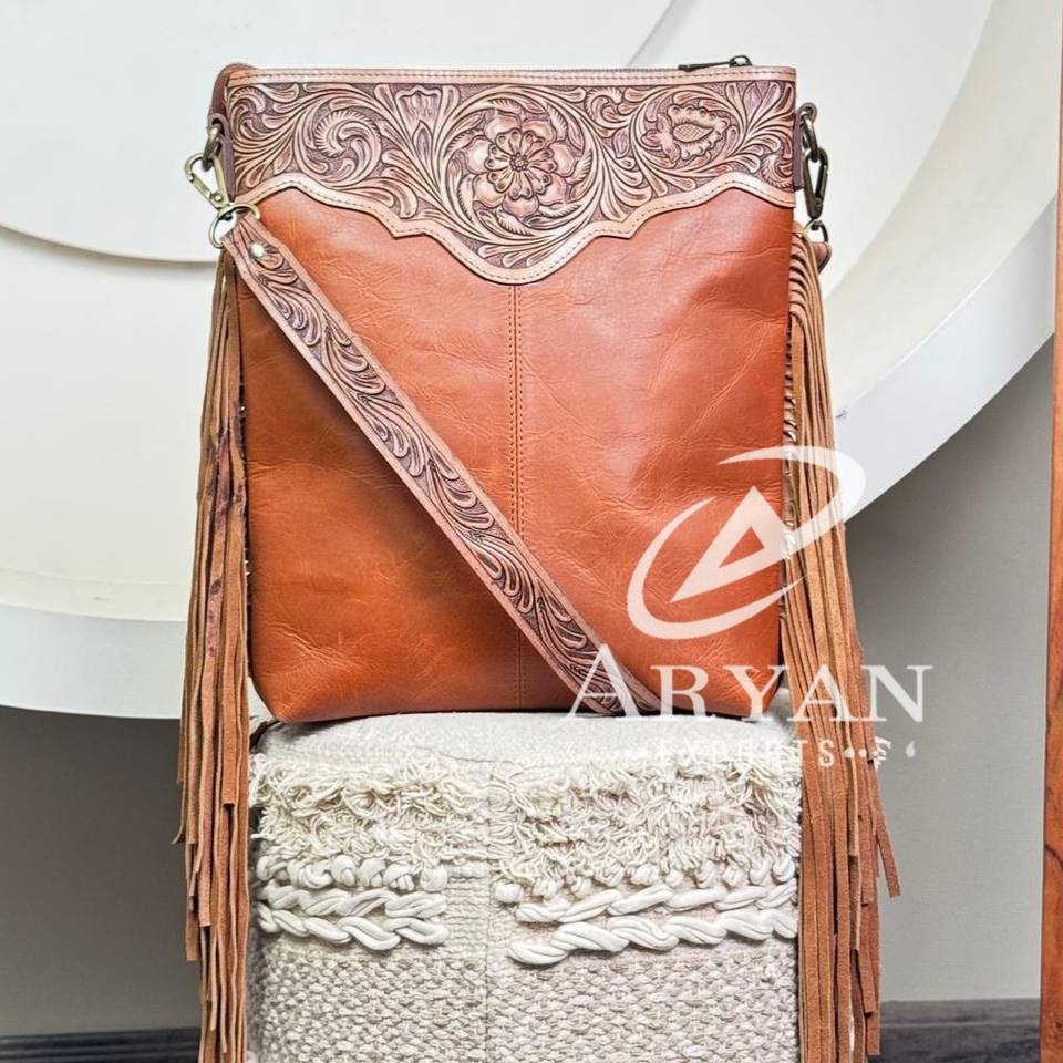 Product name:Hand Tooled Leather Large Fringe Crossbody Bag