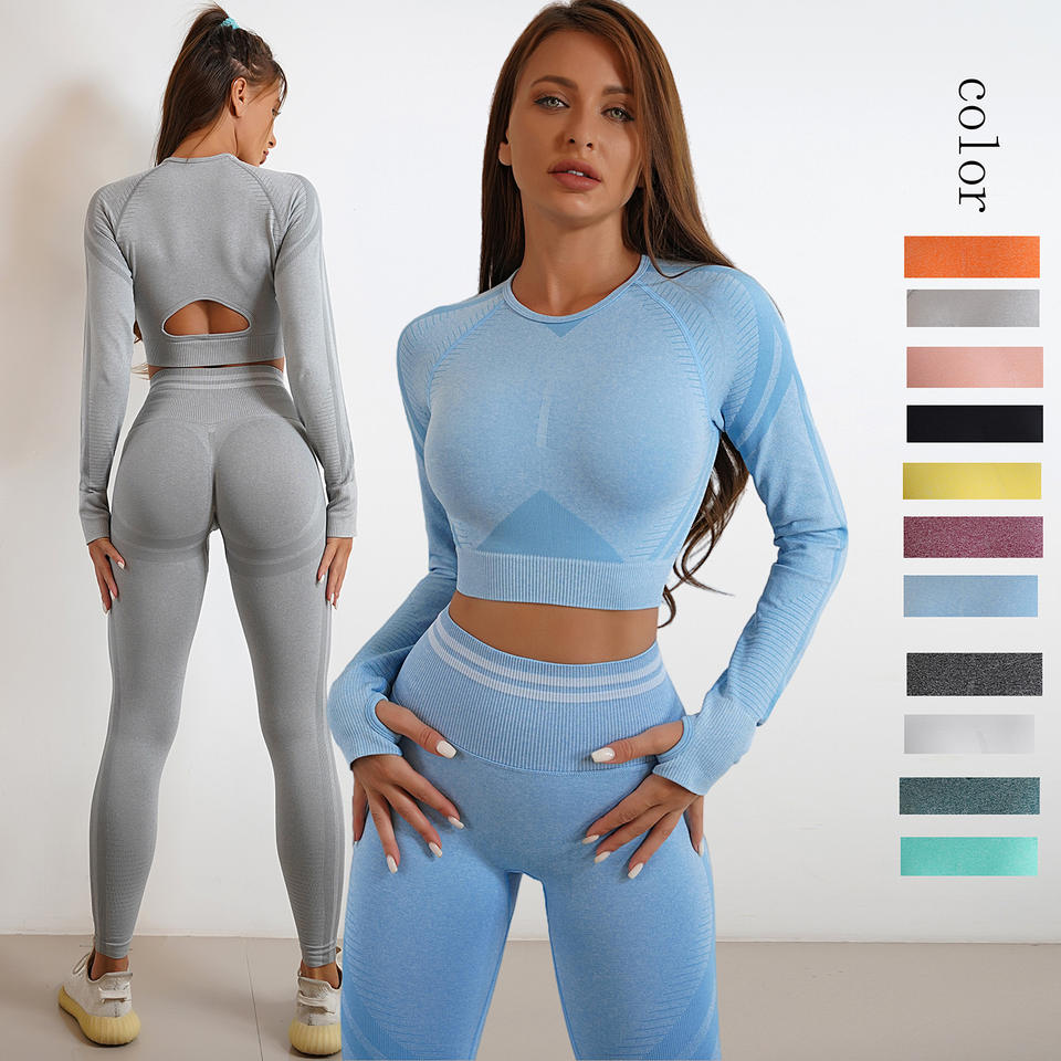 Women's Breathable Knitted Seamless Gym Yoga Set Nude Fitness Sports Crop with Long Sleeves Casual Print Style for Spring Season
