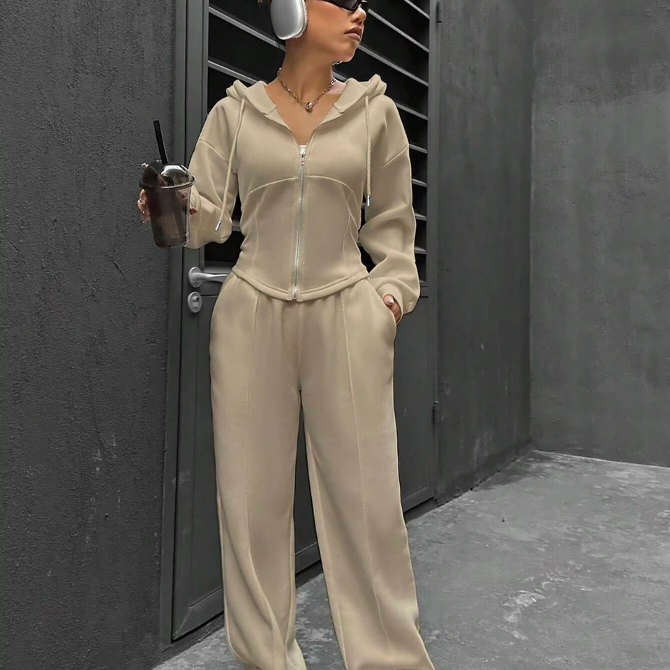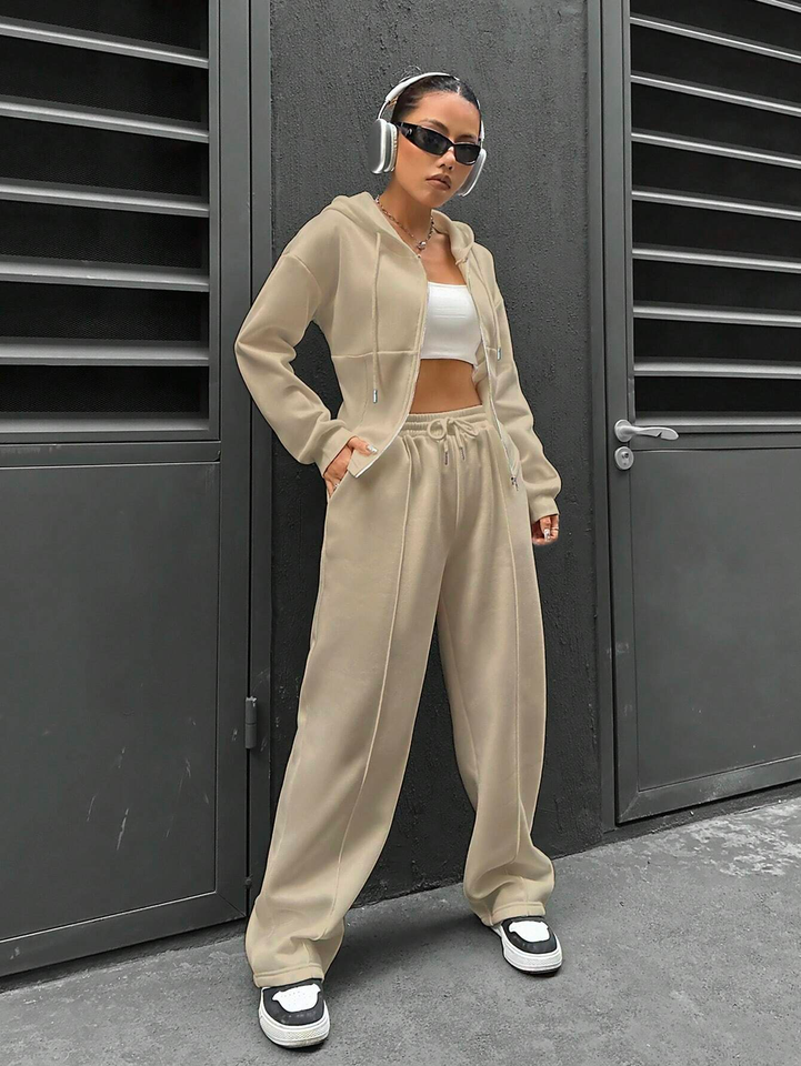 Women's Breathable Printed Hoodie and Pants Set Solid Color Zipper Front Drop Shoulder Long Sleeve Casual Two-Piece for Winter