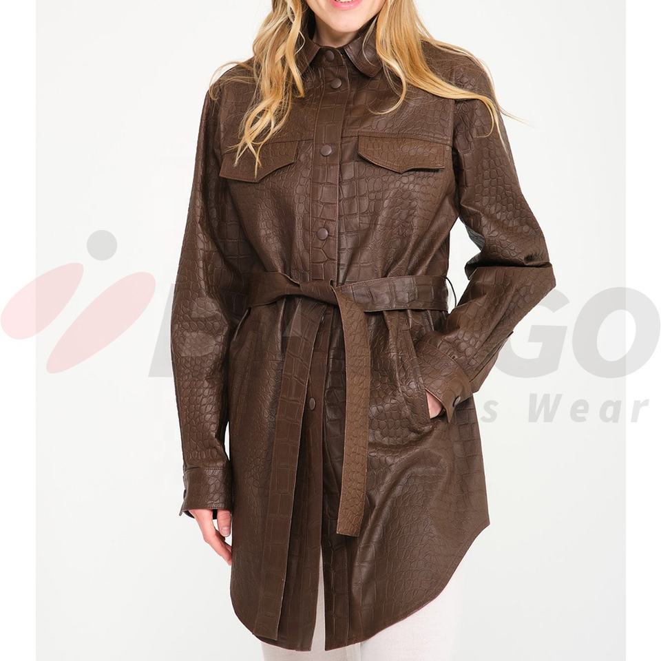 Women's Brown Leather Long Coat New Croc Print Crocodile Embossed Leather Trench Coat