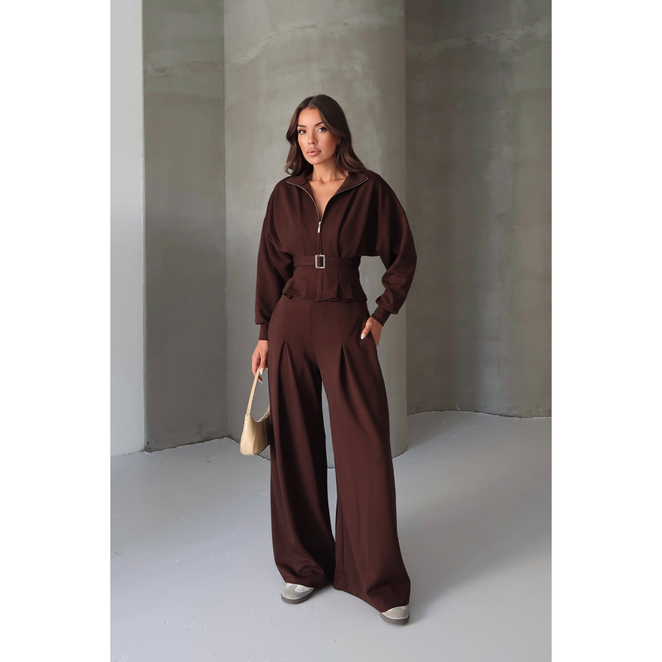 Women's Brown Modal Set Pleated Loose-Fit Trousers with Belted Zip-Up Blouse