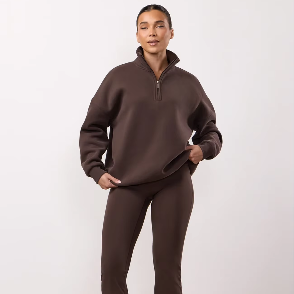 Women's Brown Quarter Zip Fleece Sweatshirt Flared Pants Two Piece Set Stand Front 100% Cotton Winter Casual Lounge Travel Wear