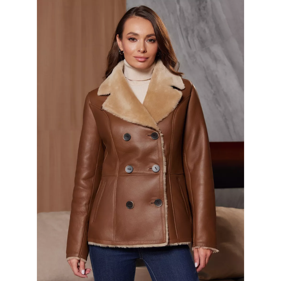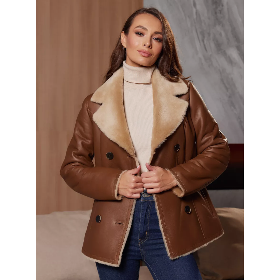 Women's Brown Sheepskin Shearling Coat 100% Genuine Leather Double-Breasted Closure Wide Lapel Collar Turned-Up Cuffs Winter
