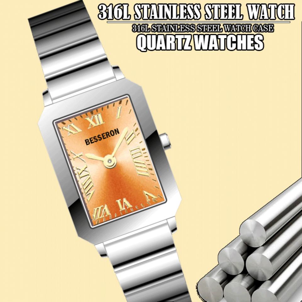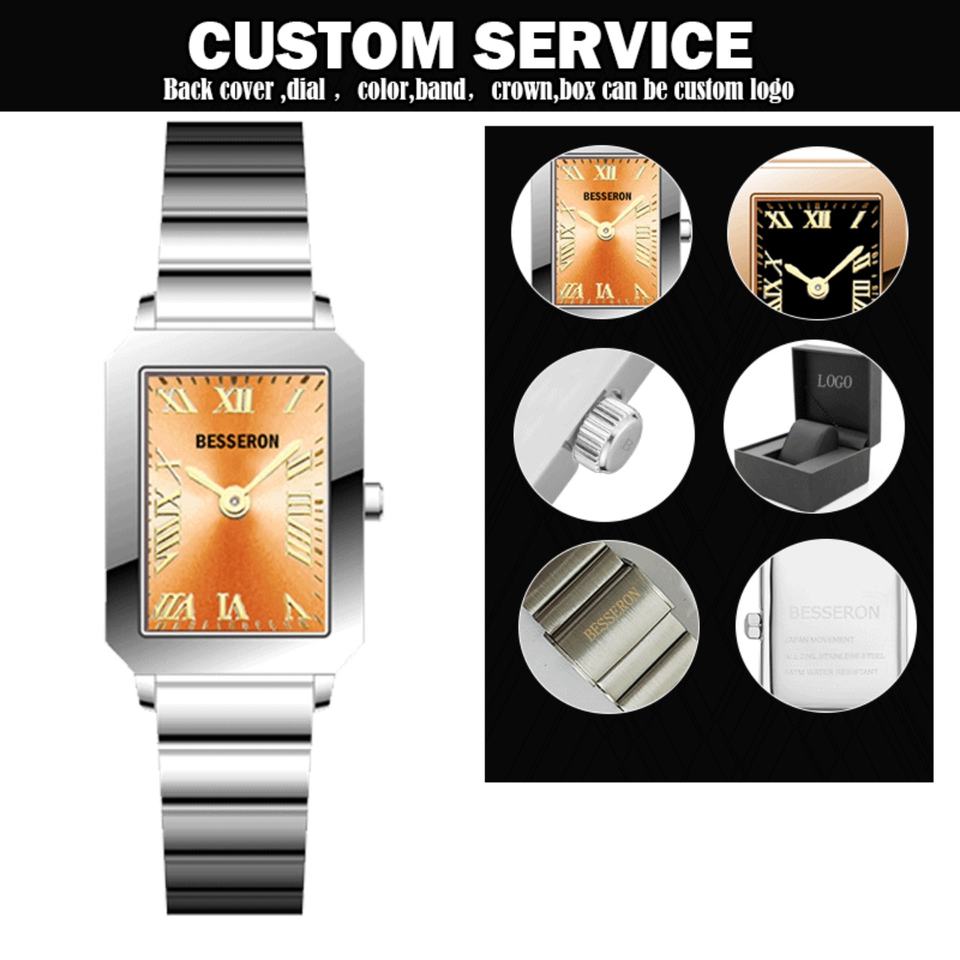 Women's Business Minimalist Quartz Watch Custom Logo Silver Square Case Gold Leather Stainless Steel Band Glass Waterproof