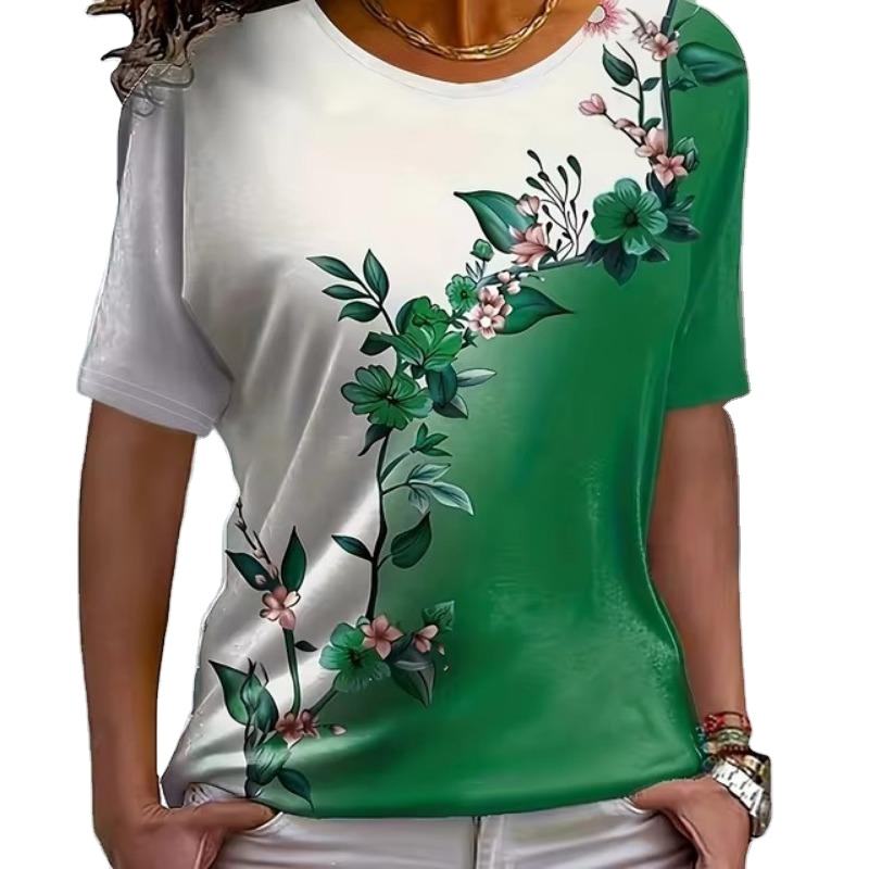 Women's Casual 100% Cotton Knitted T-Shirt Short Sleeve Pre-Washed Decorated with Lace and DTG Printed Jersey Factory Direct