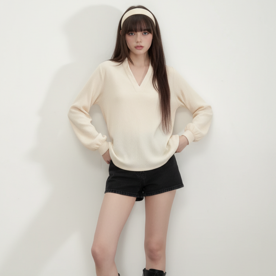 Women's Casual Cozy Waffle Knit Rib Solid V-Neck Long Sleeve Top Soft Textured One Set Eco-Friendly 100% Cotton Factory Bulk