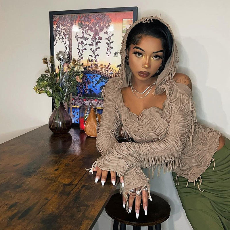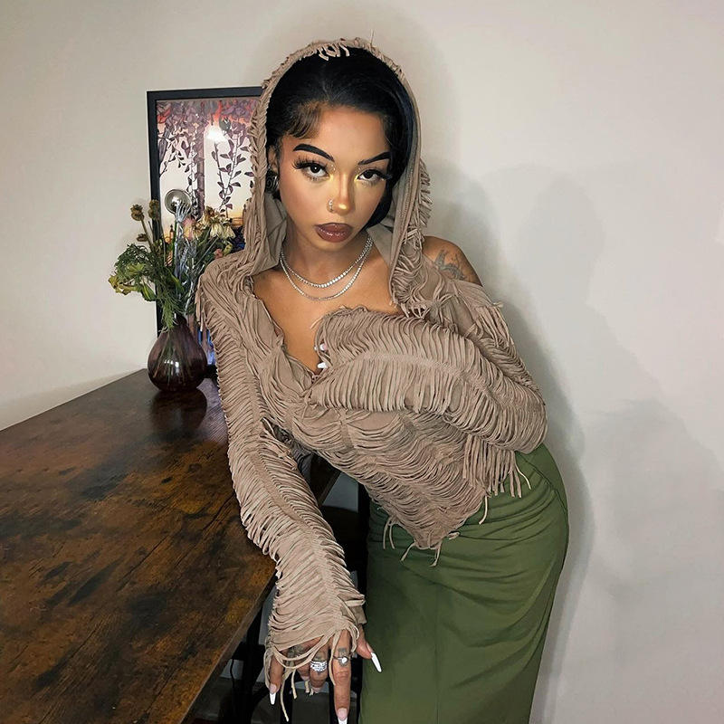 Women's Casual Fashion New Top Long Sleeve Tassel Sexy Cleavage Tops