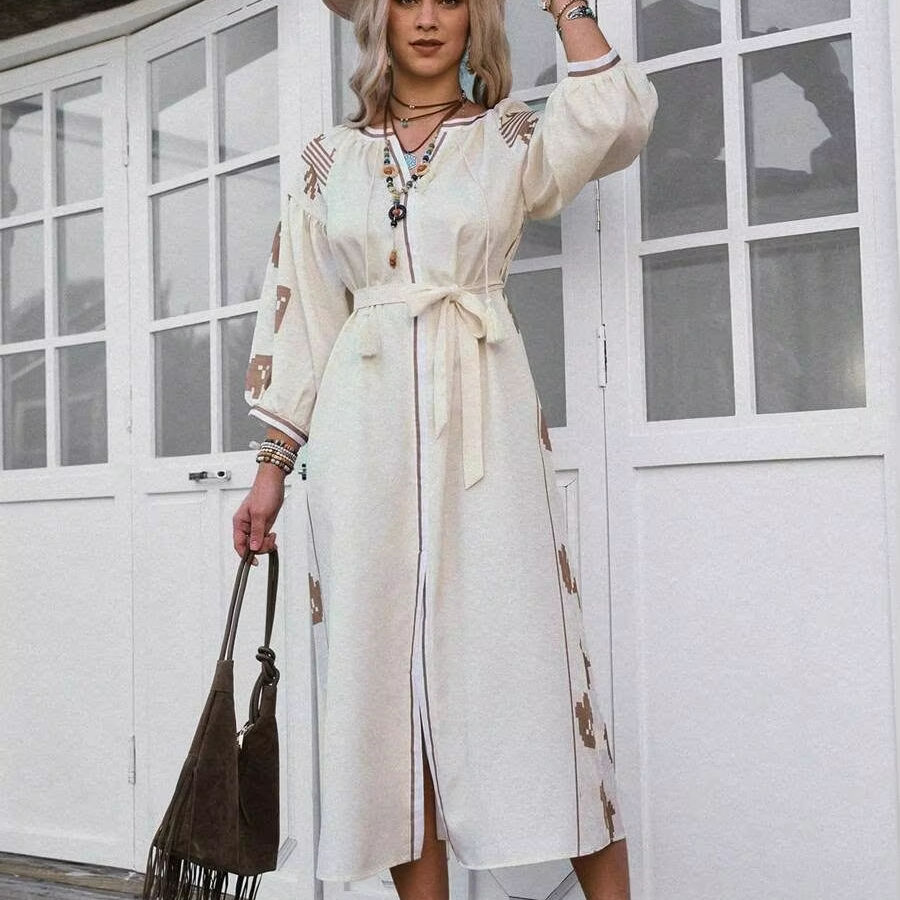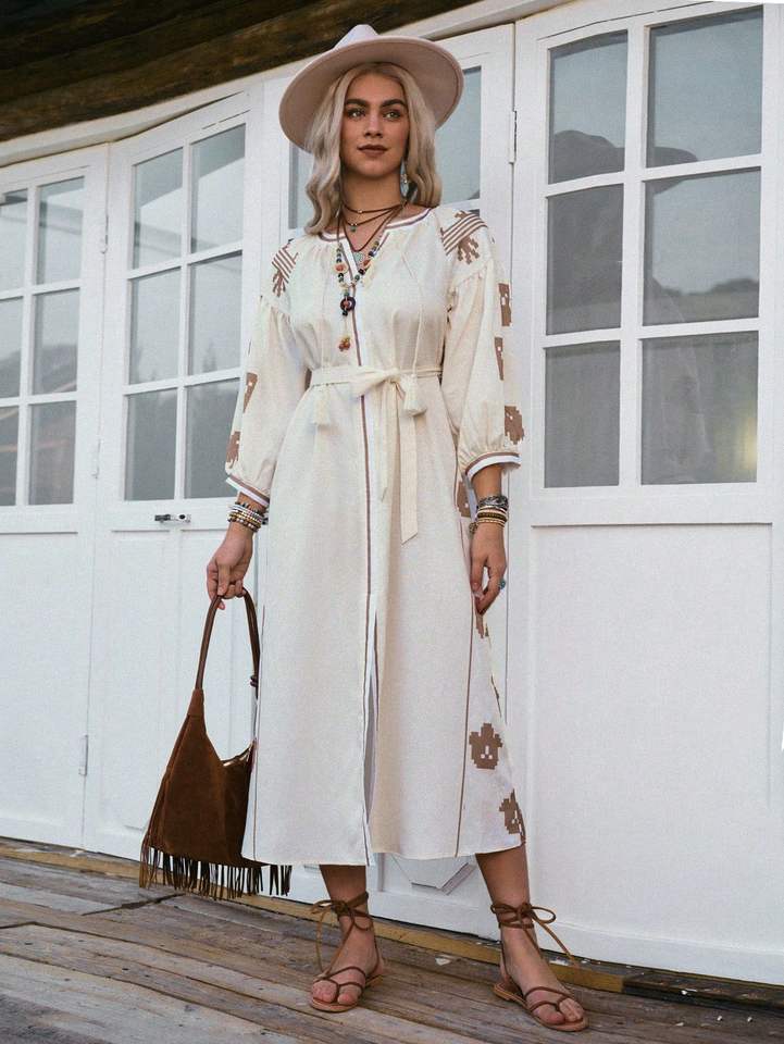 Women's Casual Maxi Dress with Embroidered Puffed Sleeves Natural Waist 100% Cotton Woven Washable Summer Collection