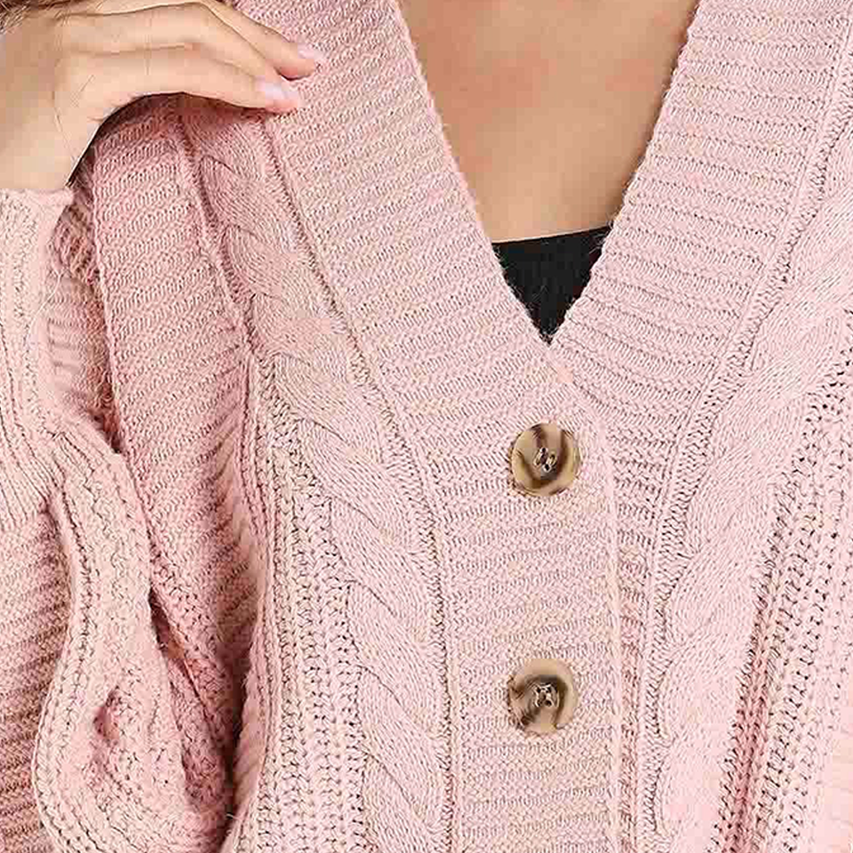 Women's Casual Oversized Cable Knit Cardigan V Neck Loose Fit Breathable Lightweight Cozy Pink Button Autumn Winter Warmth Front