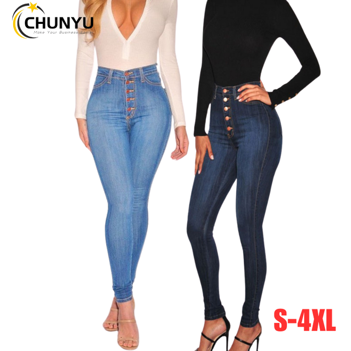 Women's Casual Slim Fit Stretch High Waisted Buttons Skinny Denim Pants Elastic Hip Lifting Jeans Trousers With Pockets