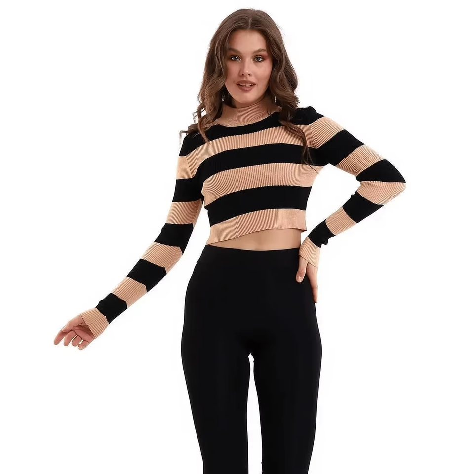 High Quality Women's Long Sleeve Turtleneck Striped Sport Crop Knitted Sweater for Casual, Office, Yoga, Autumn Winter Wholesale
