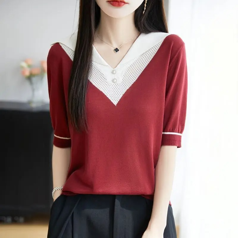 Women's Chic Summer Half-Sleeve T-Shirt New Navy 100% Cotton Large Size Loose Fit Turn-Down Collar Button Top Hollow Letter