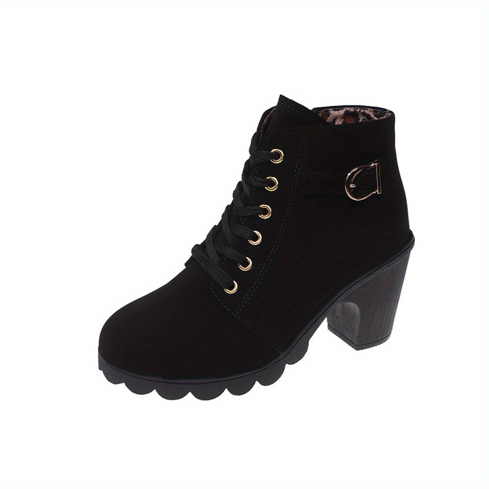 Women's Chunky Heel Ankle Boots-Black Faux Cover Lace-Up Side Zipper Booties