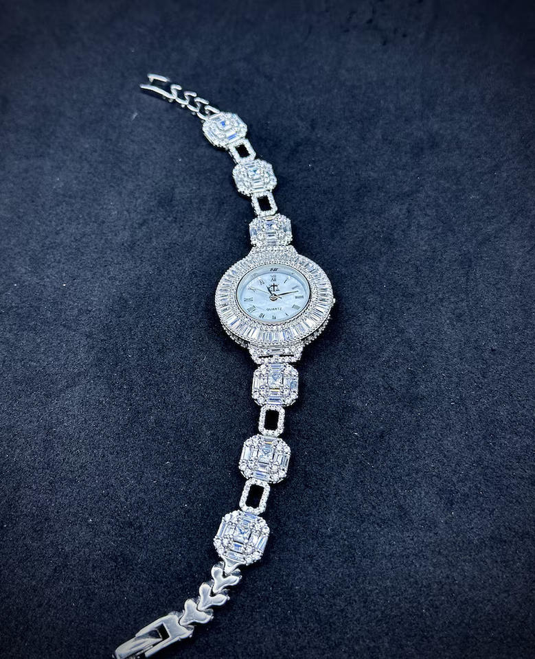 Women's Circle Iced Wrist Watch 925 Sterling Silver Handmade Shiny Zircon Gems Watch for Women's Fashion Jewelry